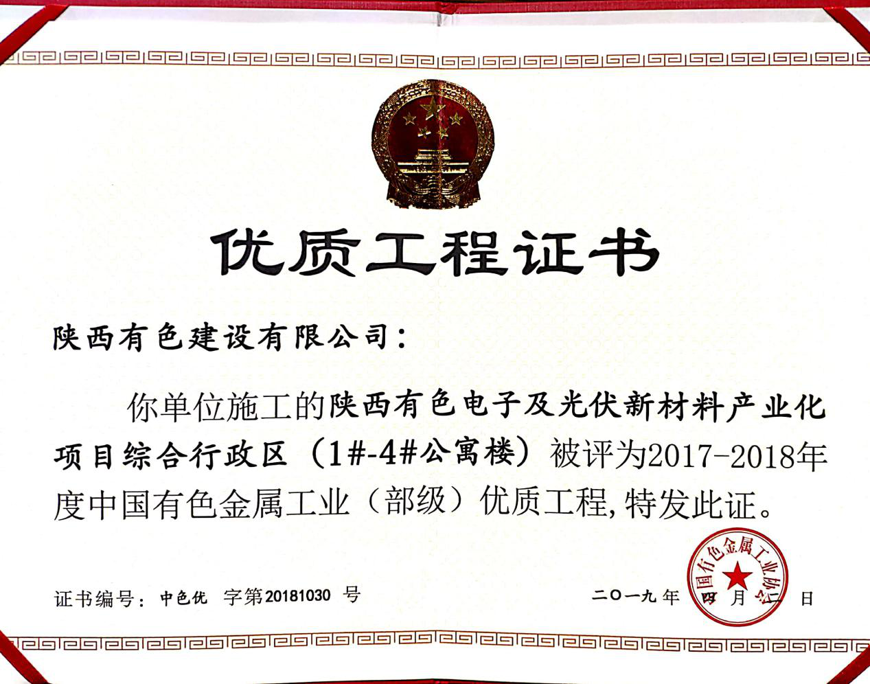 6月11日中國有色金屬工業(yè)協(xié)會召開2019年度有色金屬工業(yè)建設工程質量監(jiān)督工作會議,表彰2017-2018年度中國有色金屬工業(yè)(部級)優(yōu)質工程。公司承建的陜西有色電子及光伏新材料產業(yè)化項目綜合行政區(qū)Ⅰ標段:1#-4#公寓樓,綜合行政區(qū)Ⅱ標段:辦公樓、職工餐廳、文體中心項目被評為2017-2018年度中國有色金屬工業(yè)(部級)優(yōu)質工程。